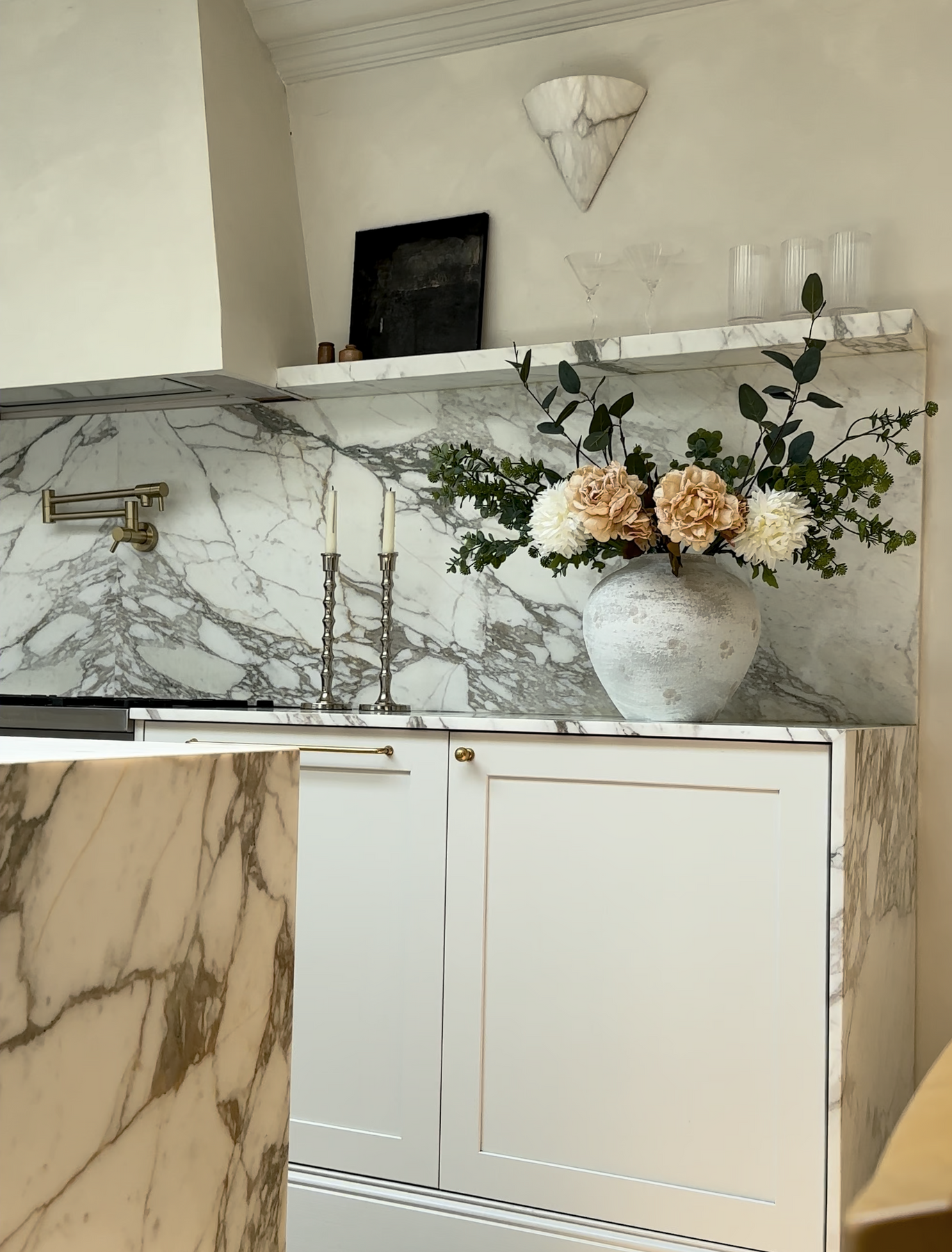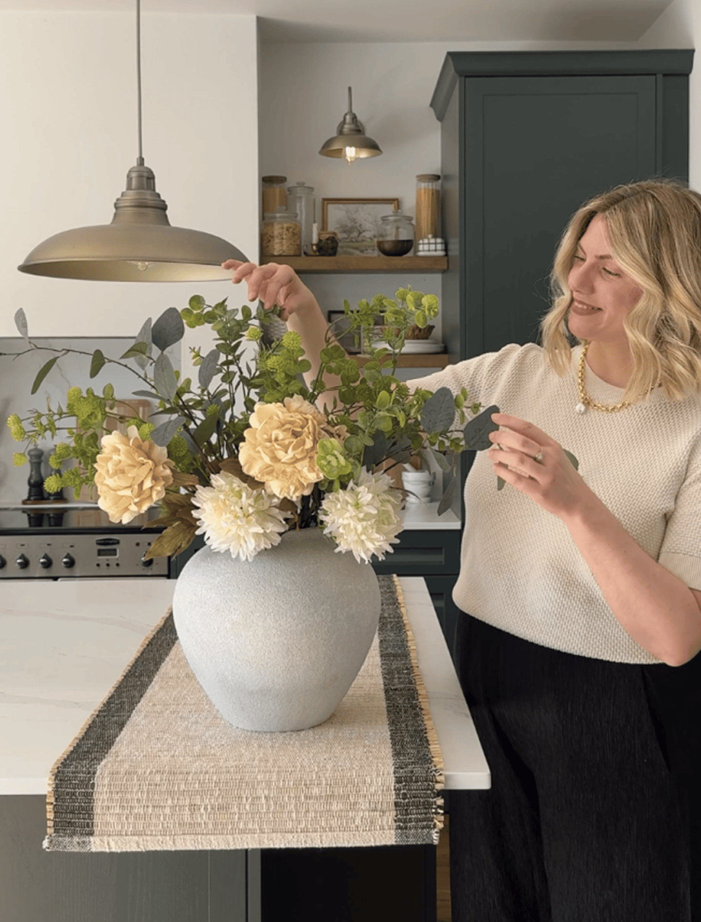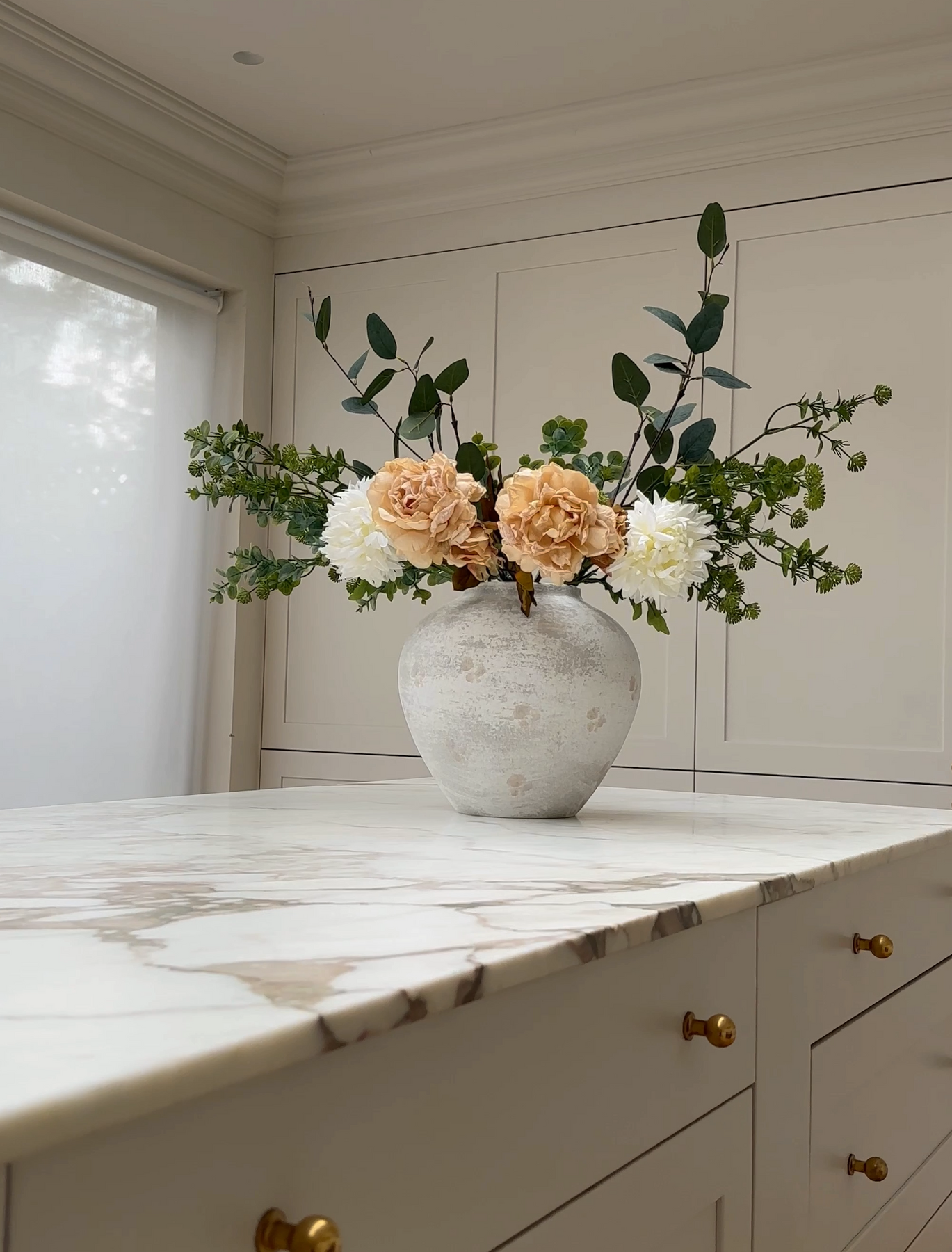 Beautiful large peonies sit nestled amongst airy green foliage in this stunning faux arrangement. If you want something that looks soft and natural but still has that wow-factor, then this is the arrangement for you. And year-round peonies? Yes please.