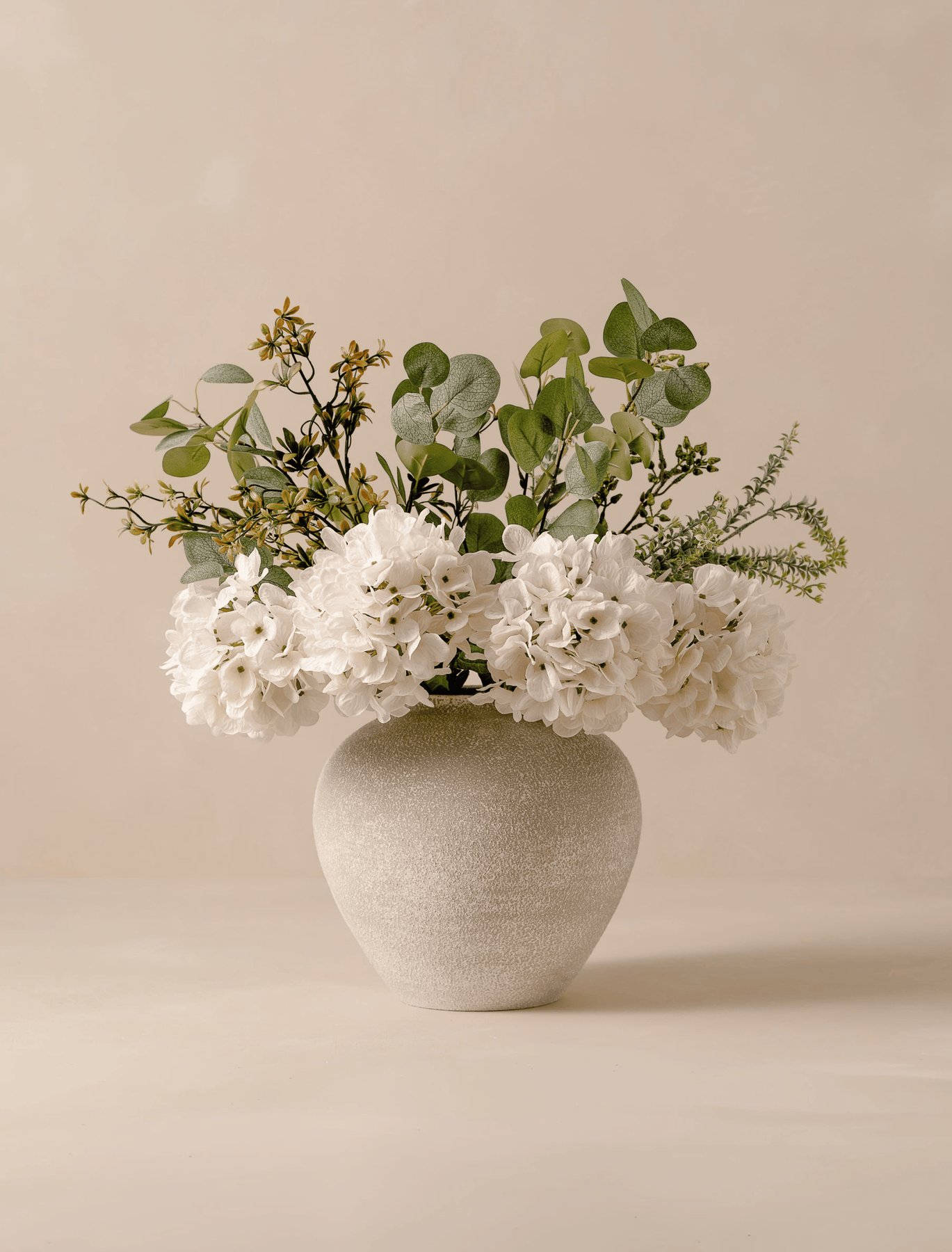 The soft green eucalyptus branches create a calming, organic backdrop, while the hydrangea blooms add a touch of sophistication and charm. Perfect for dining tables, entryways, or as a centrepiece for special occasions, this arrangement seamlessly complements modern, farmhouse, or traditional decor styles.