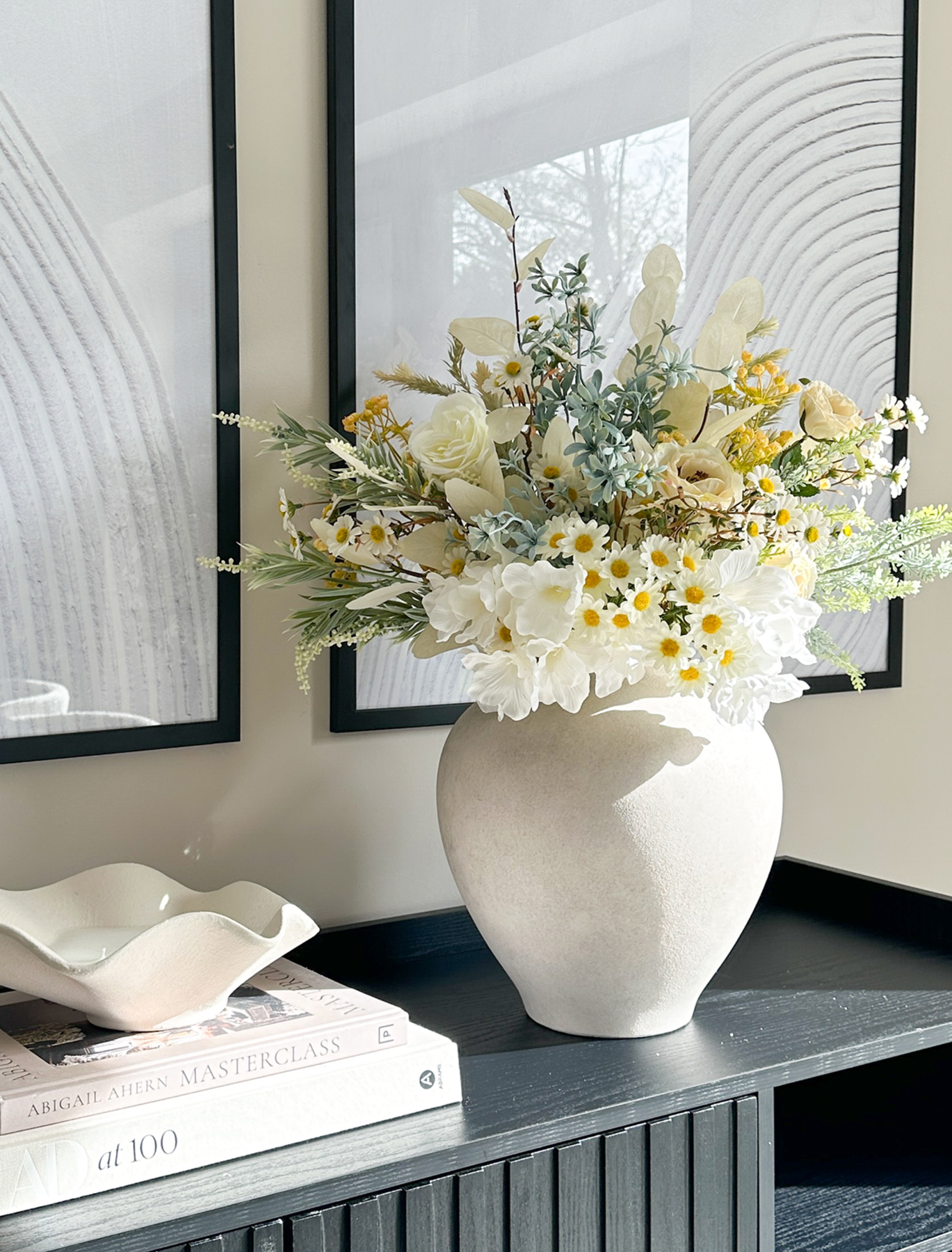 Want florist-worthy flowers year round? Add a touch of luxury to your home with this stunning Faux Spring Arrangement. Reminiscent of a walk through a countryside meadow, the stunning yellow tones in this arrangement are sure to brighten up any room.