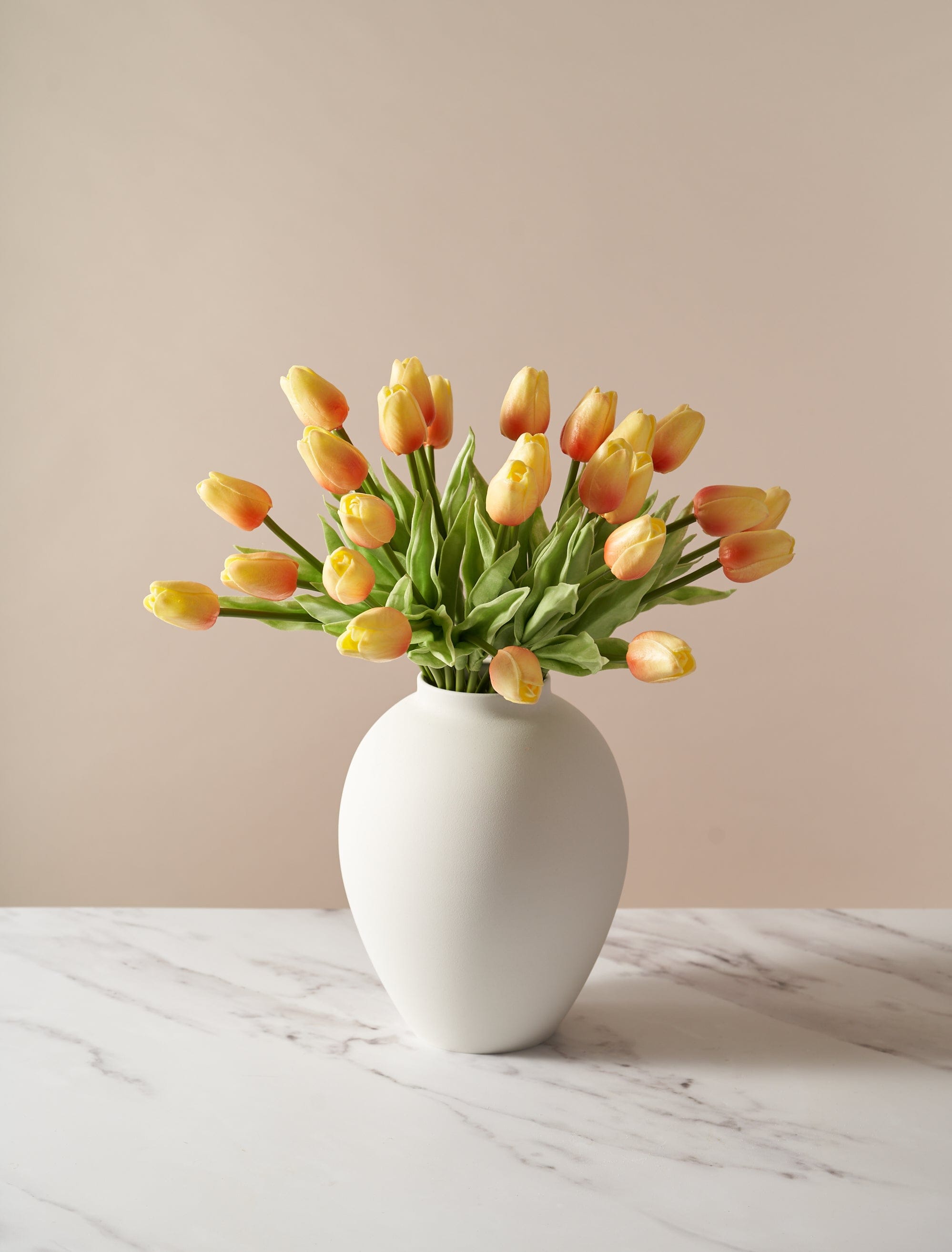 These beautiful Faux Tulips look just like the real deal, with realistic two-tone petals and bendable stems that allow you to create the exact shape you want. 'Sunrise' showcases a beautiful blend or orange and yellow tones for that classic Spring tulip colour.